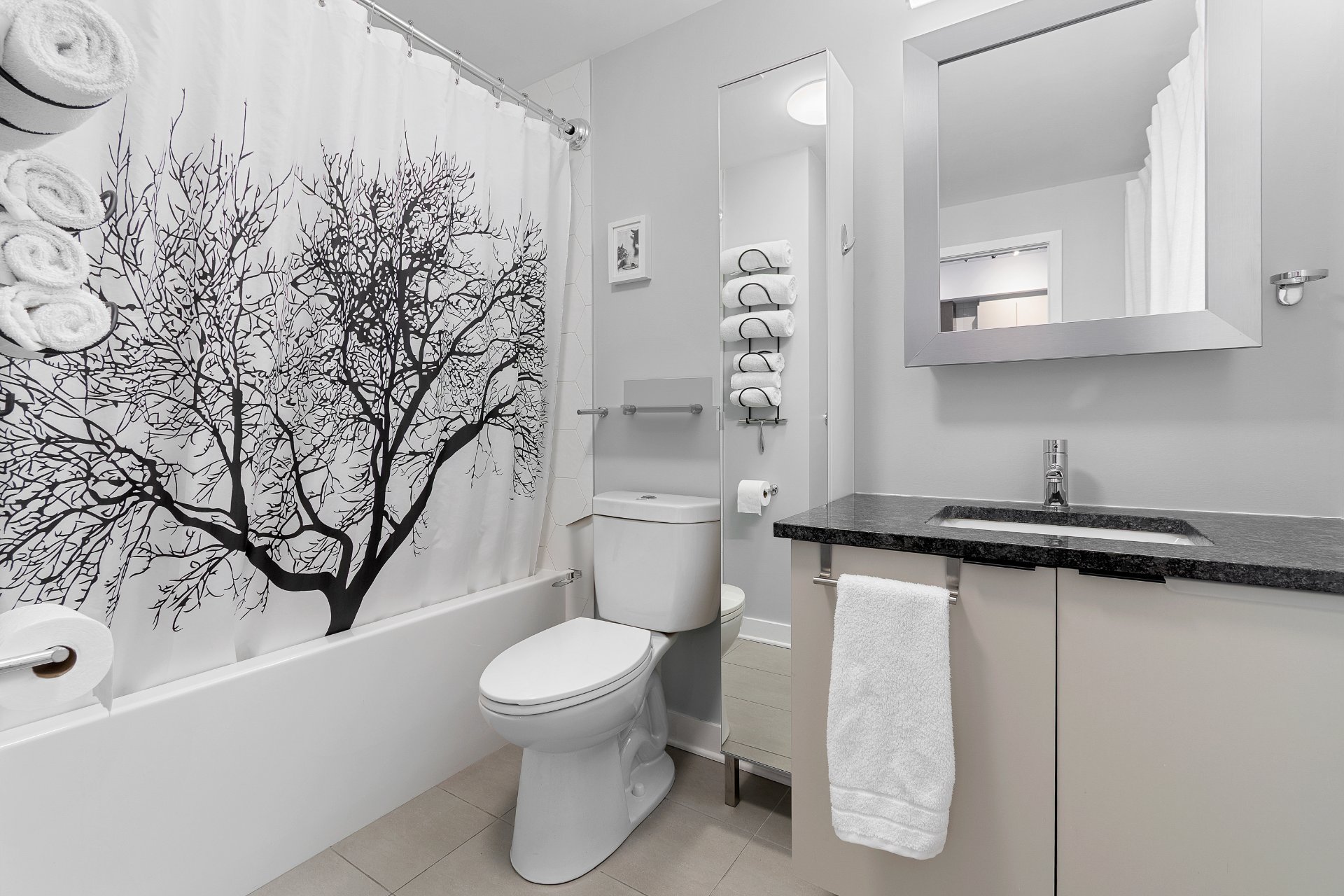 Exlcusions Television and its stand. In the bathroom: mirrored vanity, glass shelf, black metal towel rack, and hair dryer stand.